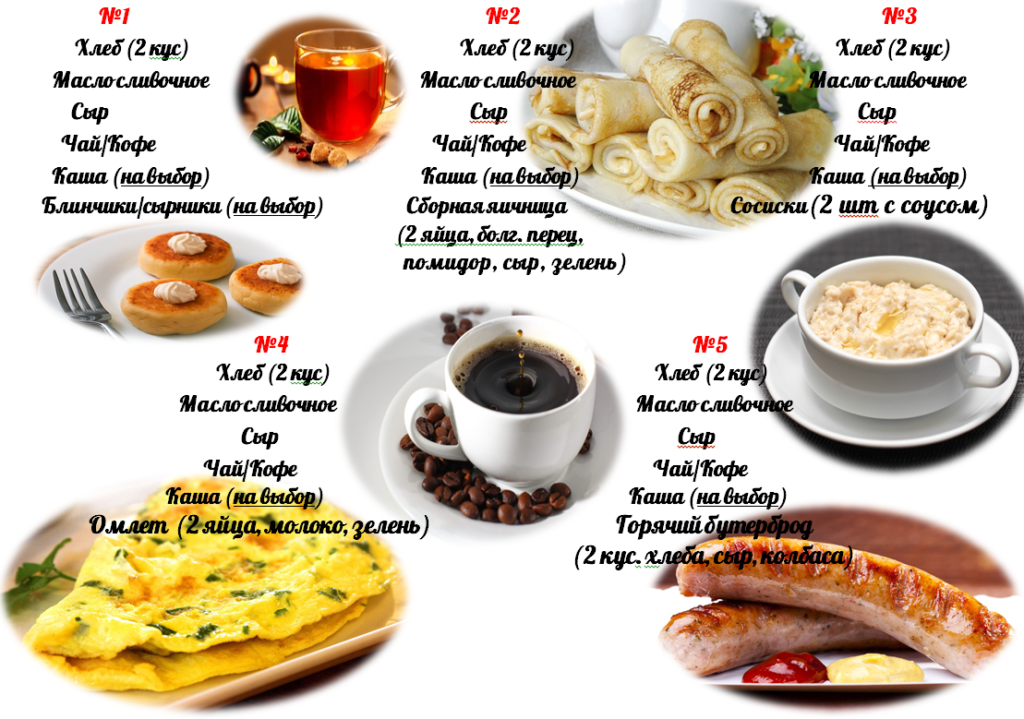 У нас в отеле представлены завтраки, 5 видов меню — на Ваш выбор.